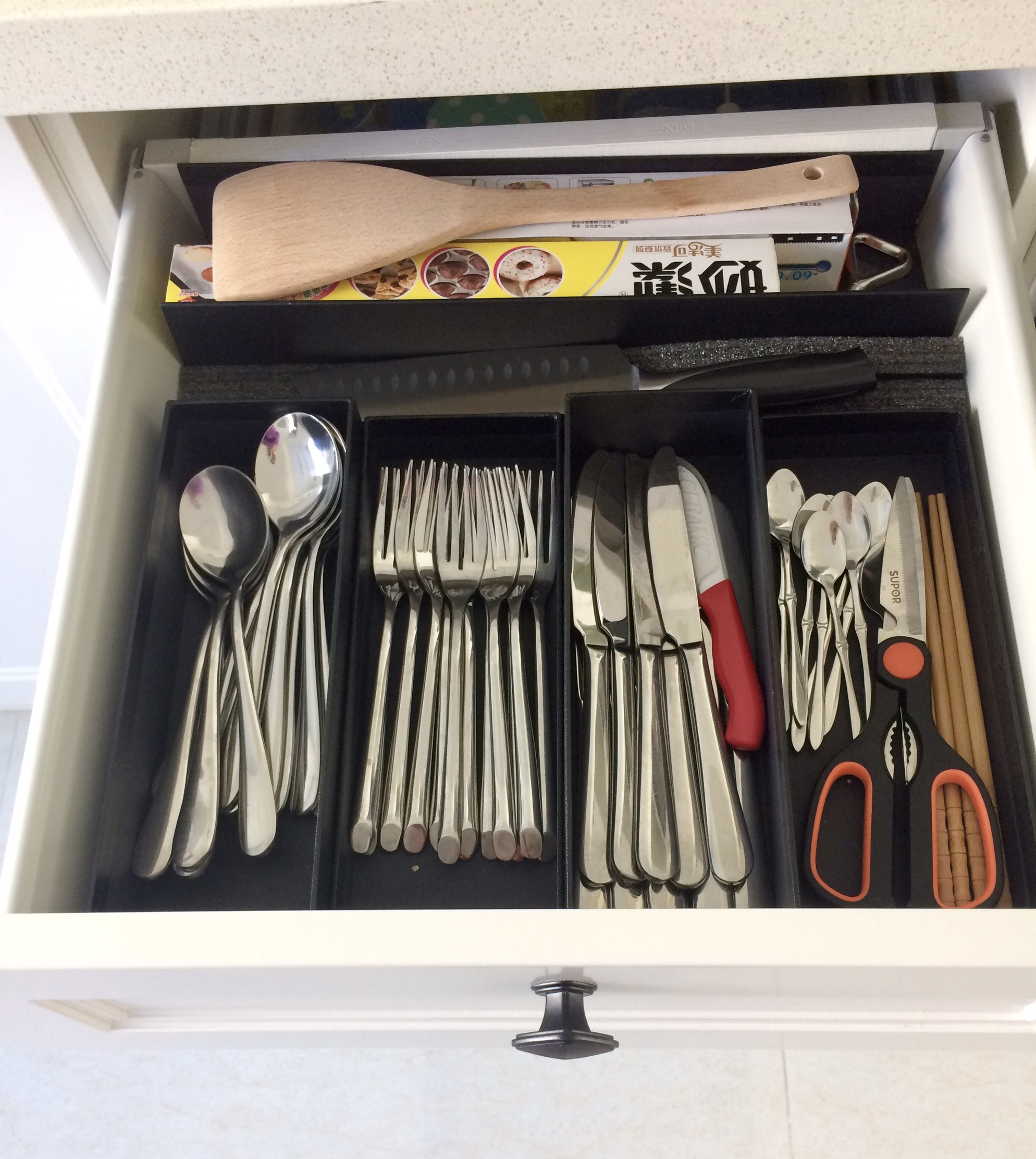 Holger hat einen großen, massiven Stockregenschirm geschenkt bekommen. Dieser war in einen schwarzen Karton eingepackt. Diesen geschickt mit dem Fußbodenmesser zerteilt und schon finden Gabel, Messer, Schere und Co. einen festen Platz in der Schublade.